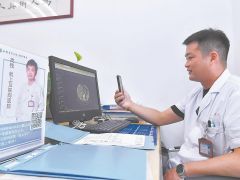 袁以洋正通过互联网医院手机端在线问诊患者。 中药房内,药剂师忙着“按方抓药”。 在智慧煎药中心,工作人员查看煎药