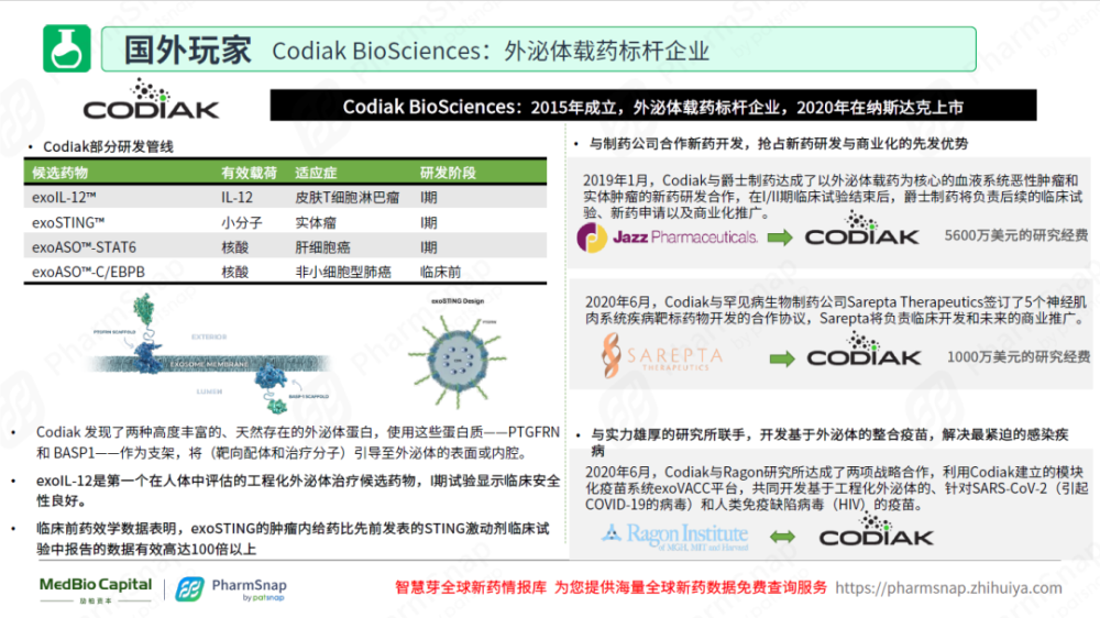 ExosomeDiagnostics等分别在外泌体载药、疾病诊断与治疗中取得了一定进展。