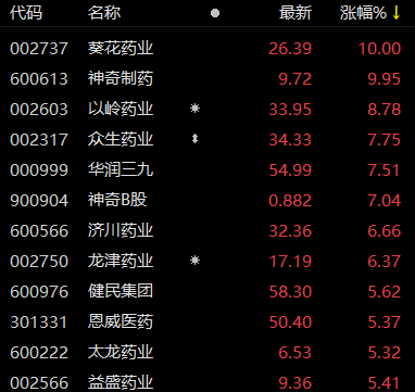 上证报中国证券网讯 11月14日早盘,中药板块快速上涨。9时44分,葵花药业、神奇制药涨停,以岭药业、众生药业、华润三九等涨超7%。