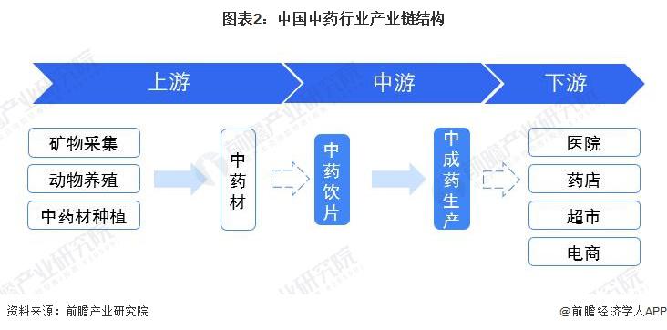 中药产业链构成较为清晰。上游包括主要为中药材的提供 ( 包括前期的矿物采集、动物养殖和中药材种植 ) ; 中游包括中药饮片加工和中成药的加工 ; 下游广泛应用于医院、药店、超市、电商等。