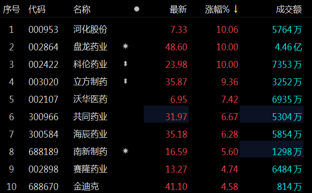上证报中国证券网讯 12月23日,医药股表现活跃,截至9:35,科伦药业、盘龙药业、河化股份涨停,立方制药、共同药业等涨超6%。
