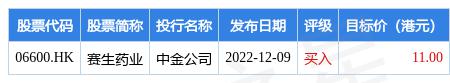 截至 2022 年 12 月 23 日收盘,赛生药业 ( 06600.HK ) 报收于 8.25 元,上涨 0.0%,换手率 4.8%,成交量 3283.8 万股,成交额 2.71 亿元。投行对该股的评级以买入为主,近 90 天内共有 1 家投行给出买入评级,近 90 天的目标均价为 11。中金公司最新一份研报给予赛生药业买入评级,目标价 11。