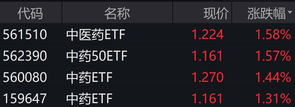 受重仓股走强影响,场内多只跟踪中证中药指数的ETF集体走强,涨逾1%。