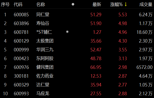 上证报中国证券网讯 3月6日,中药板块走强,截至9:53,同仁堂涨超5%,寿仙谷、太极集团、华润三九、东阿阿胶等跟涨。