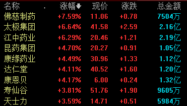 中药板块表现活跃,截至发稿,佛慈制药涨超7%,太极集团、江中药业涨超6%,昆药集团、康缘药业、达仁堂等跟涨。
