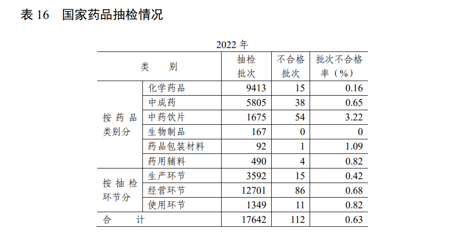 按药品类别来看,化学药品批次不合格率为0.16 %、中成药批次不合格率为0.65 %、中药饮片批次不合格率为3.22%、生物制品批次不合格率0%、药品包装材料批次不合格率为1.09 %、药用辅料批次不合格率为0.82%。