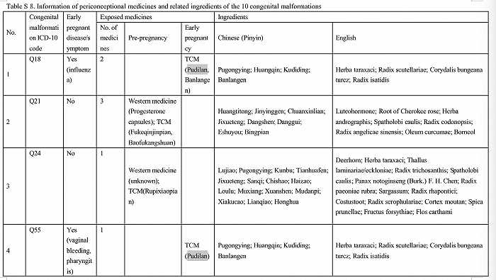 除了得前述结论,该研究也尝试寻找到底是哪些中药成分造成了婴儿先天性畸形的风险增加。在10位接触过中药且其婴儿出现先天性畸形的孕妇中,有2人在孕前接触过中药,有8人因妊娠期疾病或症状而接受了孕早期的中药治疗。其中,有4人是流感、有2人是阴道出血、有1人是咽喉炎,还有1人是阴道出血与咽喉炎。此外,这10个人此前都没有流产记录。