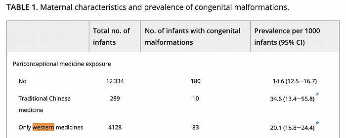 其中,未使用任何药物组的婴儿先天畸形发病率为1.46%;仅使用过治疗性西药组的婴儿先天畸形发病率为2.01%;使用过含中药组的婴儿先天畸形发病率为3.46%。