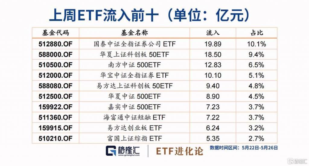 截止至 5 月 26 日,5 月以来的四个交易周,股票 ETF 资金净流入总量达 574 亿元,过去十周资金净流入更是达到惊人的 1179 亿元。