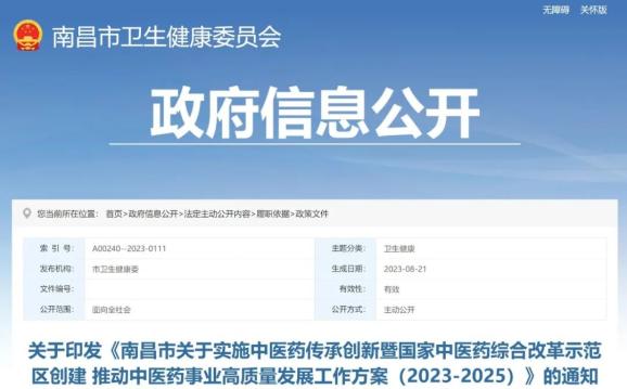 南昌市将强化专科能力建设,持续推进国家临床重点专科(中医专业)、国家中医重点专科、国家中医重点专科培育项目、省级中医临床重点专科、省级基层特色专科、市级重点专科建设,促进中西医协同发展。
