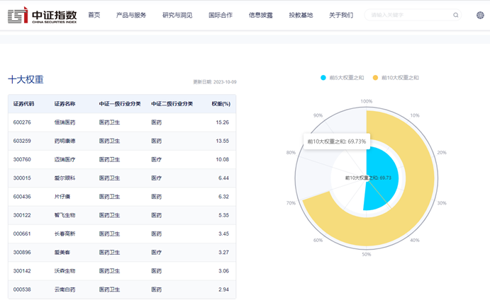 资料显示,沪深300医药卫生指数选取沪深300指数成份股中的医药卫生行业的证券,以反映沪深300指数成份股中医药卫生行业公司股票的整体表现。截至2023年10月9日,该指数的前十大权重股包括恒瑞医药、药明康德、迈瑞医疗、爱尔眼科、片仔癀等,前十大权重股合计占比约为69.73%。(数据来源:中证指数公司,指数成份股不代表个股推荐)