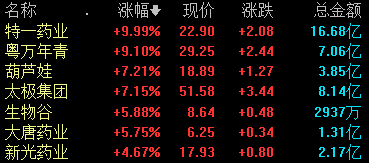中药板块午后走高,特一药业涨停,粤万年青、葫芦娃、太极集团等涨幅居前。