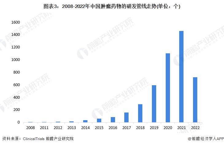 根据 ClinicalTrials 的数据显示,截止到 2022 年 5 月 27 日我国共有 4531 个肿瘤药物的研发管线。从时间线来看,目前我国肿瘤药物的研发管线主要集中在近三年。在 2021 年,我国肿瘤药物的研发管线达到了近年来峰值,为 1459 个。2022 年,我国肿瘤药物的研发管线数为 721 个。