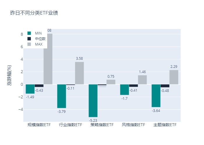 昨日股票型ETF收益率中位数为-0.41%。其中按照不同分类,规模指数中平安MSCI中国A股国际ETF收益率最高,为8.08%;行业指数中鹏华中证港股通医药卫生综合ETF收益率最高,为3.58%;策略指数中建信沪深300红利ETF收益率最高,为0.75%;风格指数中交银深证300价值ETF收益率最高,为1.46%;主题指数中银华中证机器人ETF收益率最高,为2.29%。