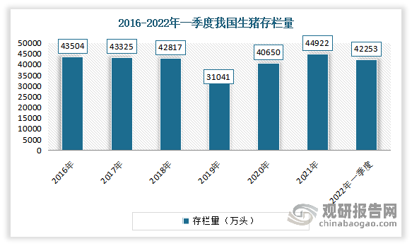 根据观研报告网发布的《中国兽药行业发展趋势研究与投资前景预测报告(2022-2029年)》显示,自2018 年 8 月以来,我国爆发非洲猪瘟疫情并在全国蔓延,且该疫病到目前都尚无有效的预防或治疗手段,主要采取扑杀深埋等措施对发病猪群进行处理。受疫情影响,2019 年生猪存栏量出现断崖式下跌,仅为 31040.69 万头,但 2020 年恢复迅速,生猪存栏量较上一年增长 30.96%,达到 40650.42 万头,基本恢复至正常水平。到2021年末,我国生猪存栏量已基本恢复至常年状态的90%以上。2022年一季度末我国生猪存栏 42253 万头,同比增加1.58%。