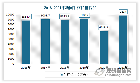 2016-2019年牛存栏量总体平稳,2020年我国养牛户因还贷的原因造成恐慌性抛售,再加上新冠疫情的影响,我国牛存栏量下降至6618.3万头,2021年中国牛存栏量达9817万头,同比增长48.3%。