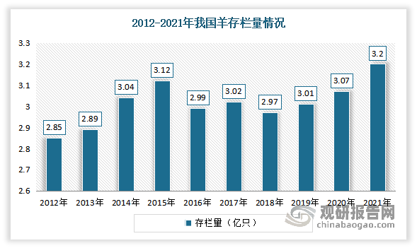 目前我国羊养殖业已成为世界大国。羊存栏量方面,近年来随着我国肉羊养殖规模的不断扩大,我国羊存栏量不断增加。据资料显示,2020年我国羊存栏量达30655万只,同比2019年增长1.9%。2021年年末羊存栏31 969.0 万只,比上年增加1 314.2 万只,增幅达4.3%。