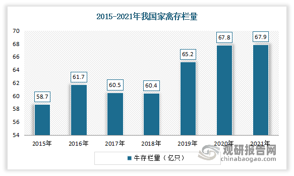 家禽业在我国的养殖生产中占据重要地位。自改革开放以来,我国家禽业已经取得了飞速发展,家禽饲养量、禽蛋产量已连续多年保持世界第一,并已成为我国农村经济主要支柱产业。数据显示,2020年我国家禽存栏量67.8亿只,同比增长4.0%。2021年我国家禽存栏量达67.9亿只,与上年同期基本持平。