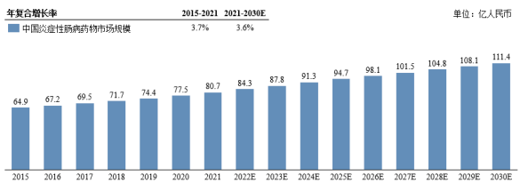 近年来,随着人们诊疗意识的提升以及小分子创新药的研发及应用,我国炎症性肠病药物市场在不断增长,从2015年64.9亿元增长至2021年80.7亿元,年均复合增长率为3.7%,预计2030将进一步增长至111.4亿元,2021年至2030年年均复合增长率为3.6%。