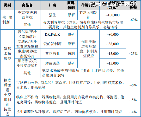 炎症性肠病治疗药物主要有四类,分别是氨基水杨酸类、皮质类固醇激素、免疫抑制剂和生物制剂:其中,氨基水杨酸制剂是活动期轻中度性结肠炎、轻度克病和缓解期性结肠炎和克病的一线用药,典型药物是美拉沙嗪;激素类是活动期中重度性结肠炎和克病患者的一线用药;免疫抑制剂可用于使用激素无效或依赖后的轻中度性结肠炎和克病患者;生物制剂包括TNF-α抑制剂、抗粘附生物制剂、IL-12/23抑制剂等,适用于激素或免疫抑制剂疗效不佳,或激素依赖的中重度患者,或可用于诱导期应答的中重度患者的维持治疗。此外,新型小分子药物如JAK抑制剂托法替布在2018年获得FDA批准,可用于治疗中重度活动性性结肠炎患者。目前,我国炎症性肠病药物市场竞争格局如下: