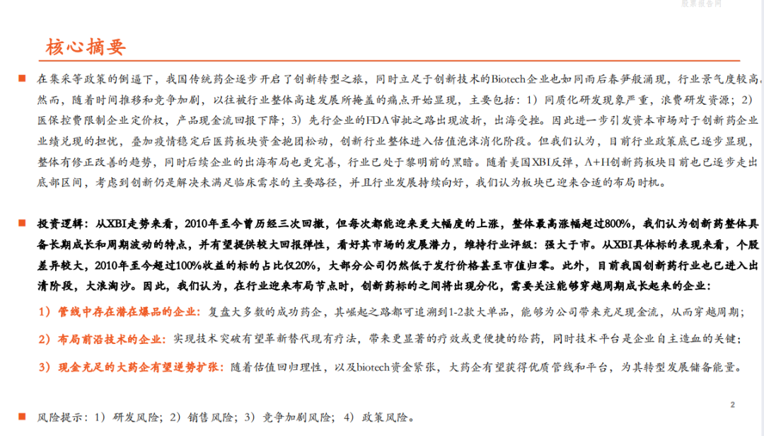 从XBI走势来看,2010年至今曾历经三次回撤,但每次都能迎来更大幅度的上涨,整体最高涨幅超过800%,我们认为创新药整体具备长期成长和周期波动的特点,并有望提供较大回报弹性,看好其市场的发展潜力,维持行业评级:强大于市。从XBI具体标的表现来看,个股差异较大,2010年至今超过100%收益的标的占比仅20%,大部分公司仍然低于发行价格甚至市值归零。此外,目前我国创新药行业也已进入出清阶段,大浪淘沙。因此,我们认为,在行业迎来布局节点时,创新药标的之间将出现分化,需要关注能够穿越周期成长起来的企业: 后台回复:《平安证券-生物医药行业:创新药进入行业出清阶段,寻找分化下的机会》即可获取完整版报告
