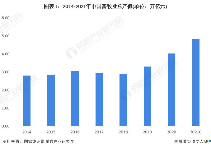 近年来,随着我国对畜牧业相关肉蛋奶等产品需求的扩大,我国畜牧业整体发展良好,2017、2018年受国家宏观经济环境等多方因素的影响,总产值有所下降,2019年和2020年逐步回升。根据国家统计局数据显示,2020年畜牧业总产值为40266.67亿元,创下历史新高,增长率为21.75%。据我国畜牧业发展现状来看,预计2021年中国畜牧业将保持增长态势,达到4.84万亿元左右。