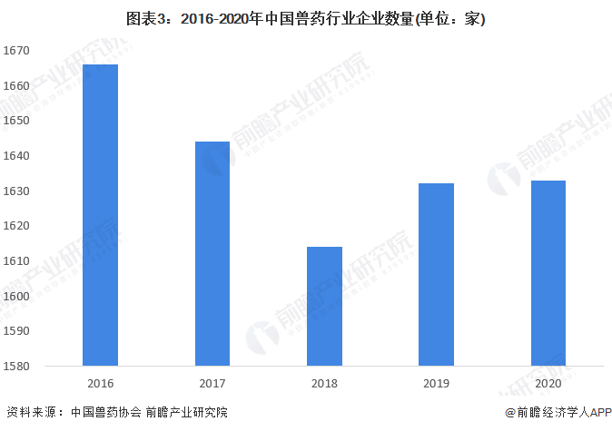 据中国兽药协会统计数据,我国兽药行业企业近年来有所下降。2016年我国兽药企业个数为1666家,完成了472.29亿元的产值。而到了2020年中国兽药行业企业个数降至1633家,却完成620.95亿元的产值。虽然兽药生产企业的个数有所下降,但我国兽药行业仍在畜牧业的发展下保持发展态势。