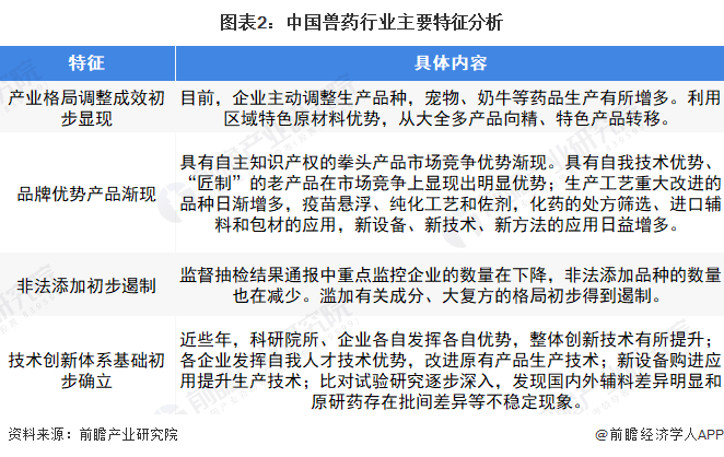 从我国兽药行业市场来看,在我国畜牧业等相关行业的不断带动下,我国兽药行业的产业格局调整成效已初步显现,大部分企业主动调整生产品种,宠物兽药逐渐成为兽药行业的重点发展领域。除此之外,在我国不断发布法律规范兽药质量的北京下,我国兽药市场非法添加情况已得到初步遏制,监督抽检结果通报中重点监控企业数量有所下降,非法添加品种的数量也在降低,预计我国兽药行业未来将迎来更好、更安全的发展。具体特征如下: