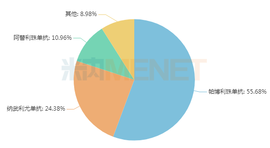 米内网数据显示 ,目前全球共有19款PD-(L)1(含单抗、双抗)获批上市,2021年PD-(L)1市场规模超过300亿美元,K药(帕博利珠单抗)、O药(纳武利尤单抗)、T药(阿替利珠单抗)三款PD-(L)1占据了全球91%的市场,而信达的信迪利单抗、百济神州的替雷利珠单抗以及恒瑞的卡瑞利珠单抗3款国产PD-(L)1合计占比不足1%。